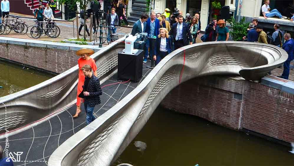 پل فلزی (تصویر بالا) که بر روی یک کانال در آمستردام توسط Joris Laarman Lab طراحی شده بود، توسط شرکت MX3D با استفاده از فناوری Robotic Arm Wire Arc Additive Manufacturing چاپ شد. این پل هوشمند 12-meter طول از فولاد ضدزنگ شامل یک شبکه حسگر تعبیهشده است که به محققان آمستردام کمک کرد تا نقش سیستمهای IoT در محیط ساختهشده را مطالعه کنند. ساختار این پل با استفاده از طراحی مولد و تکنیکهای بهینهسازی توپولوژی توسعه یافت تا طرح خیرهکننده آن ایجاد شود و در عین حال سبکتر باشد. با این حال، این پل قابل دائمی بودن نبود و پاییز گذشته پس از پایان مجوز دو ساله خود برداشته شد.