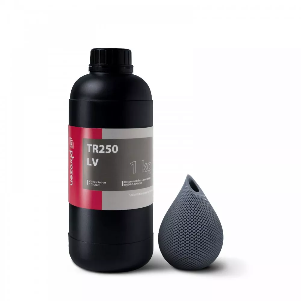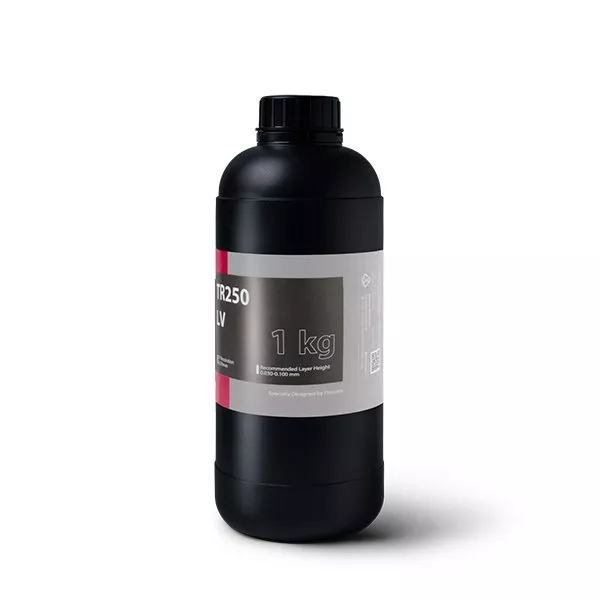 رزین TR250LV فروزن با حلالیت الکل می باشد که به توصیه این شرکت نباید بیشتر از 30 ثانیه در داخل الکل قوطه ور باشد. رزولوشن استاندارد چاپ در این رزین مهندسی 47 میکرون است که در مقایسه با سایر رزین های مشابه دقت قابل قبولی دارد. موضوع دیگر در خصوص رزین TR250 زمان چاپ پایین هر لایه است که می تواند خبر خوبی برای کاربرانی باشد که سرعت در چاپ برایشان مهم است. این رزین را می توان در انواع پرینتر های رزینی با تکنولوژی استریولیتوگرافی LCD و DLP استفاده کرد و محدودیت در نوع قطعات چاپی وجود ندارد.