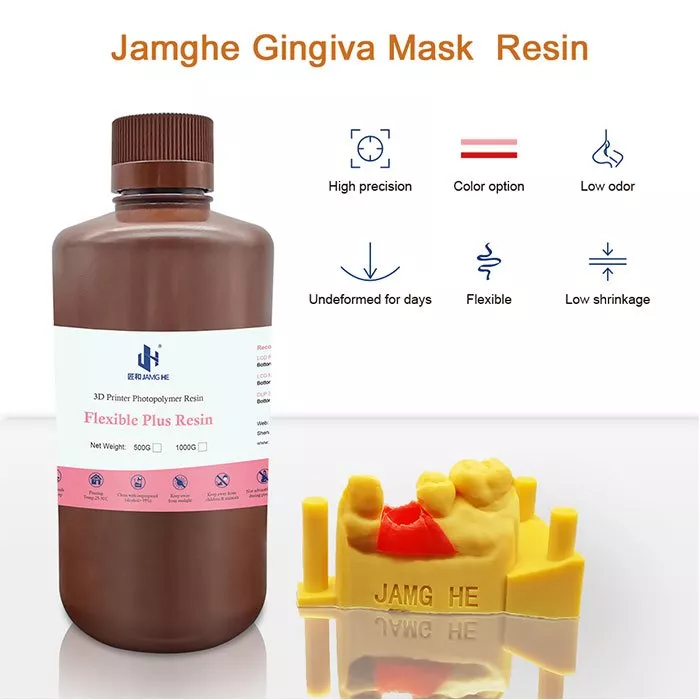 رزین Gingiva Mask برند JamgHe قابل استفاده در لابراتوار های دندانسازی مختلف می باشد. این رزین منعطف لاستیکی از دقت ابعادی بالا و شرینک بسیار کم برخوردار می باشد که در دو رنگ صورتی و قرمز موجود است. رزین منعطف جینجیوا از بو کم و کیفیت سطح بالا برخوردار است و منطبق با انواع پرینتر های سه بعدی رزینی LCD و DLP می باشد.