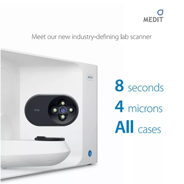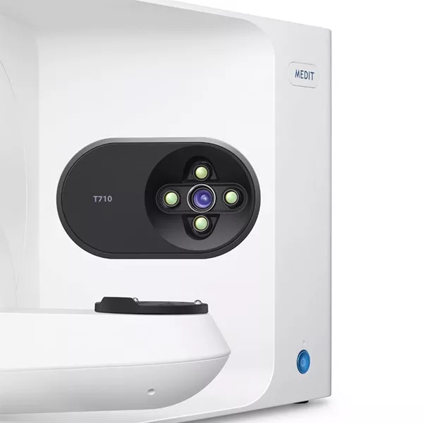 اسکنر لابراتواری مدیت مدل T710 یک اسکنر رومیزی میباشد که دارای 4 دوربین 5 مگا پیکسلی است.این اسکنر با چهار سیستم دوربین جدید با وضوح 5.0 مگاپیکسل و فناوری اسکن نور آبی، تضمین میکند که مدلها و تصاویر شما کاملاً اسکن شده و تمام نقاط کور را از بین میبرد.اسکنر Medit T710 مجهز به موتور اسکن سریع و الگوریتم نرم افزاری بسیار کارآمد است که یک اسکن تمام قوس را تنها در 8 ثانیه انجام می دهد. در زمان استفاده از این اسکنرنیازی به انتظار برای پردازش اسکن قبلی برای شروع اسکن جدید نیست و در واقع پردازش برای حداکثر کارایی در پسزمینه انجام میشود و به شما امکان میدهد موارد را به صورت متوالی و بدون وقفه اسکن کنید. سیستم موقعیت یابی پیشرفته و پرسرعت سری T جدید برای عملکرد بهینه برای لابراتوارها ، سرعت بخشیدن به گردش کار و افزایش بهره وری آن ها طراحی شده است.