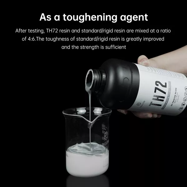 رزین سخت TH72 رزیون یک نوع رزین سخت با انعطاف پذیری بلندمدت است که دوام بالایی دارد. هنگامی که از رزین سخت TH72 رزیون برای چاپ استفاده می شود نیاز به محافظت زیادی ندارد زیرا این ماده به سادگی آسیب نمی بیند و با گذر زمان اندازه آن کوچک نمی شود. به همین دلیل رزین سخت TH72 رزیون گزینه خوبی برای پرینت سه بعدی اشکال و تصاویر است و برای محصولاتی که نیاز به دوام و پایداری بالا دارند مناسب است. این رزین با خاصیت جذب بسیار کم آب عملکرد پایدار را حتی در رطوبت بالا یا شرایط زیر آب تضمین می کند. با توجه به انطباق TH72، می توان از آن به عنوان یک عامل سخت کننده برای سایر مواد نیز استفاده کرد.این یک ماده ایده آل برای چاپ مجسمه های اسباب بازی و مینیاتور است.