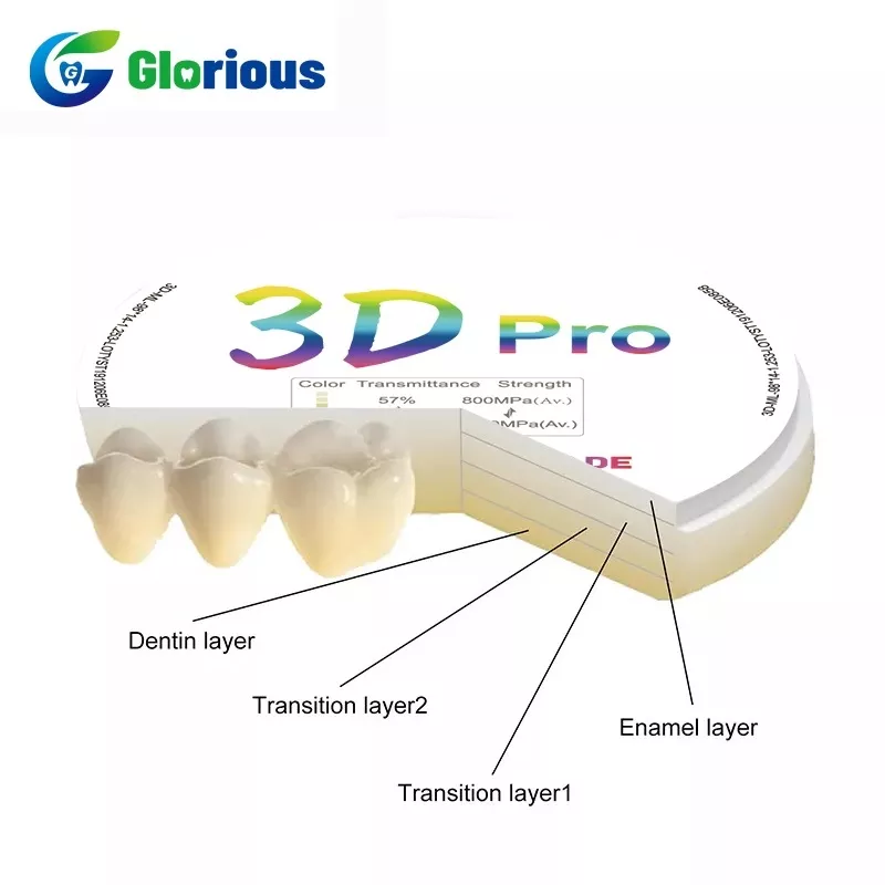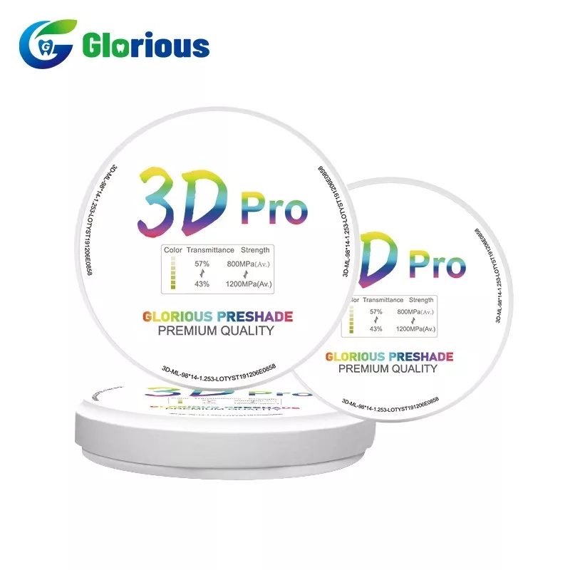 3d pro یک بلوک زیرکونیایی با استحکام و شفافیت عالی است. این یک بلوک تاج کامل با اثر درجه بندی طبیعی است که از طریق چندین لایه با شفافیت های مختلف از 1200 مگاپاسکال در لایه پایین تا 800 مگاپاسکال در لایه بالایی ایجاد می شود. به دلیل شفافیت بالای سطح اکلوزال/انسیزال و سایه طبیعی قسمت حاشیه، هر کسی می تواند بدون رنگ آمیزی یک تاج کامل رضایت بخش ایجاد کند. شما فقط باید یک بلوک تری دی پرو گلوریس را از 16 سایه ویتا انتخاب کنید، تاج را با پرینتر سه بعدی بسازید و آن را زینت کنید. بنابراین نیازی به رنگ آمیزی نیست.و این باعث صرفه جویی قابل توجهی در زمان و کار مورد نیاز برای رنگ آمیزی و خشک کردن می شود.
