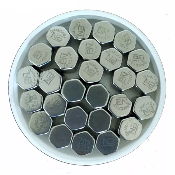 آلیاژ سرامیکی نیکل-کروم دامکست مدل NB در دسته بندی آلیاژ های غیر گرانبها ریختگری با دانه های درشت شش ضلعی یکی از پرکاربردترین مواد مصرفی در فرآیند ترمیم دندان با پرسلن در لابراتوار های مختلف می باشد و در واقع یکی از پر استفاده ترین تجهیزات کوره دندانسازی است. کستینگ راحت, ضایعات کم و استحکام بالا سه ویژگی مدل NB دامکست می باشد که در انواع پروتز های ثابت دندانی بکار می رود. یکی از دلایل محبوبت آلیاژ ریختگری دامکست NB بخاطر سازگاری بالا با انواع پودر های موجود در بازار ایران می باشد و به راحتی ذوب و باند می شود. یک بسته یک کیلوگرمی دامکست شامل بلوک های شش ضلعی یک شکل آلیاژی می باشد که بر روی هر بلکوک لوگو برند حکاکی شده است.