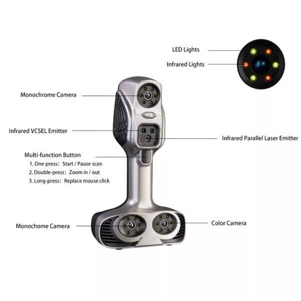 اسکنر اسکن تک مدل m3 میتواند اسکن را بدون مارک انجام دهد و سرعت کاررا بهبود بخشد.هنگامی که اشیاء دارای ویژگی های هندسی یا بافت پیچیده هستند، می توانید از حالت تراز ترکیبی اسکنر اسکن تک (ترازهای مارکر) استفاده کنیم کافی است چندین مارک را روی قسمت های پیچیده بچسبانیدو فرآیند اسکن را آغاز کنید.یکی از ویژگی های فوق العاده این اسکنر اسکن موی انسان است که هر اسکنری نمیتواند این کار را انجام دهد. اسکنر scantech ireal m3 دارای دو منبع نوری میباشد. نور ساختاری VCSEL مادون قرمز و لیزر موازی مادون قرمزکه هر دو نورهای نامرئی هستند و دارای استاندارد ایمنی محصول لیزر (EU) EN 60825 میباشند و به چشم هیچ آسیبی وارد نمیکنند. این محصول را می توانید با مناسب ترین قیمت همراه با گارانتی اصالت کالا از مجموعه آذرین تهیه نمایید.