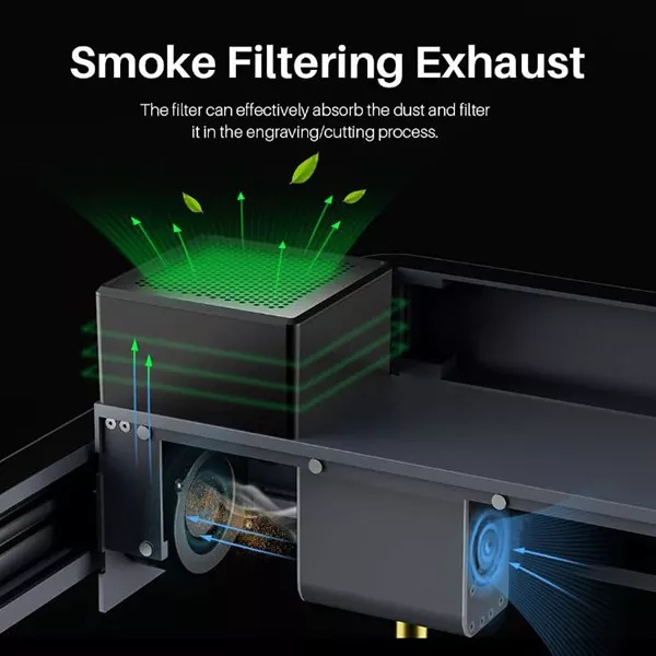 دستگاه حکاکی لیزری ELEGOO PHECDAدارای سطح حکاکی بزرگ ( اینچ 400x400 (15.75x15.75 میلیمتر برای رفع نیازهای روزانه DIY و برای پردازش پروژه های هنری بزرگ است.دستگاه حکاکی لیزری الگو با توان خروجی 10W عملکرد و تطبیق پذیری بالایی را ارائه می دهد. با چگالی انرژی بالای 0.07mm*0.13mm نقطه کانونی (10W: 0.06mm*0.06mm)، می تواند بدون افت کیفیت به سرعت تا 25000 میلی متر در دقیقه دست یابد. این دستگاه میتواند طیف گسترده ای از مواد از جمله چوب، بامبو، چرم، کاغذ کرافت، فولاد ضد زنگ و آلومینیوم را حکاکی یا برش دهد.فیلتر خروجی دود دستگاه و دو فن خنک کننده روی سر لیزر به طور موثر دود اگزوز و گرد و غبار تولید شده در حین حکاکی را فیلتر می کنند. پس از حکاکی، فن ها یک دقیقه دیگر کار می کنند تا عمر مفید فن را طولانی تر کنند، نویز را کاهش دهند و در مصرف برق صرفه جویی کنند. کارتریج فیلتر دارای روکش جداشدنی برای جداسازی و تعویض آسان فیلتر می باشد.