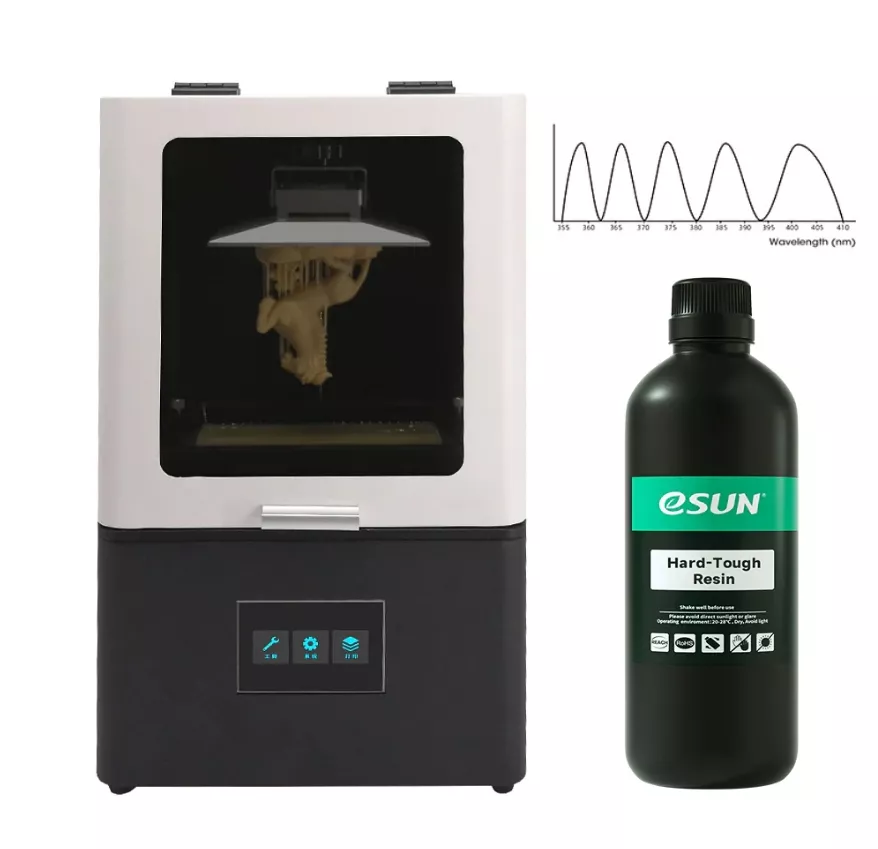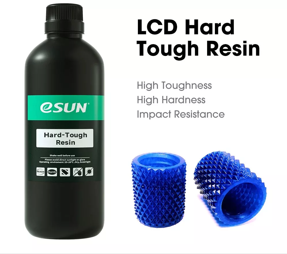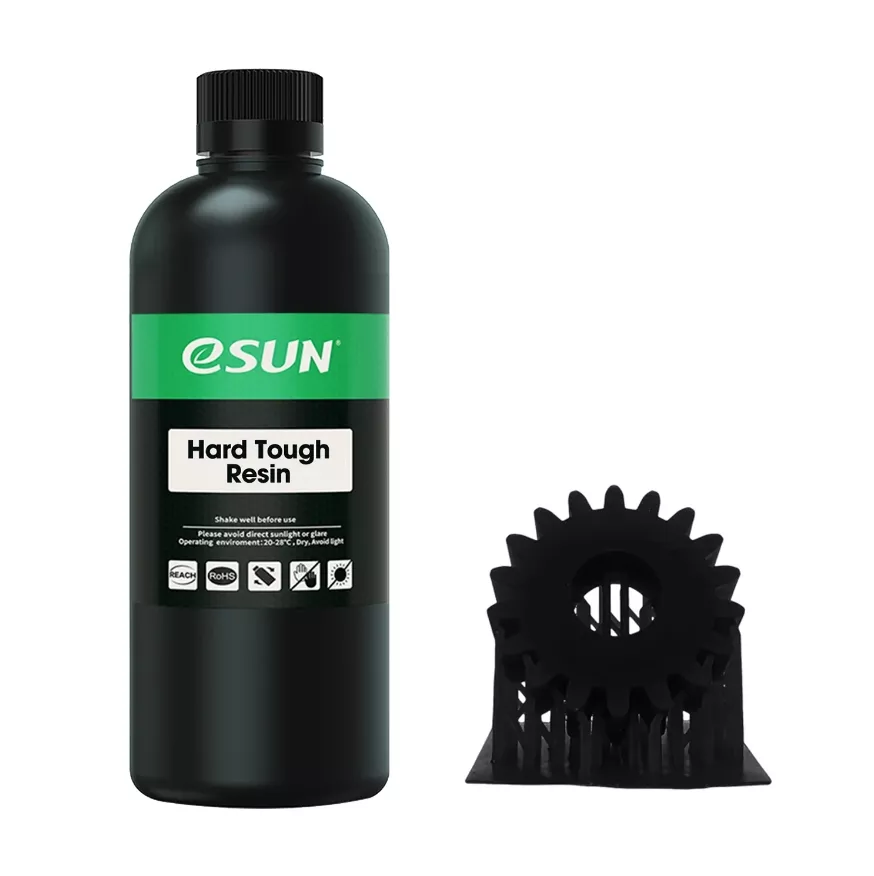 eSun Tough resin with high physical strength, high hardness and high toughness similar to ABS filament. Experiments have shown that the 3D model produced by eSUN's Hard-Tough Resin product, such as the carrier gear, can withstand high impact forces and other high-strength mechanical pressures. While using electric drills to test the toughness of the resin, there's no breakage on the model even after a few drills. For the application field, the material needs to have extremely high stress and strain performance, and that's why eSUN developed Hard-Tough Resin Hard-Tough Resin is a urethane acrylate photocurable resin suitable for LCD printers.