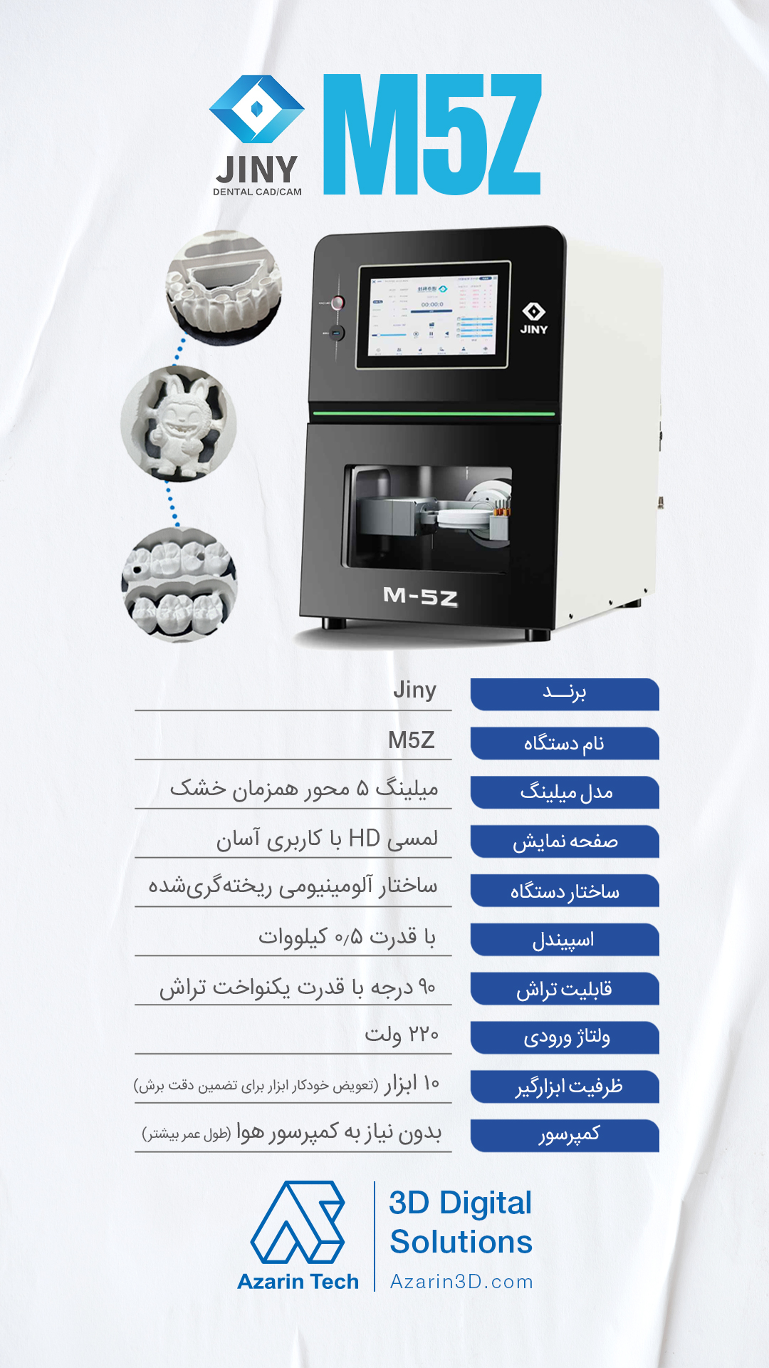 M5Z با حرکت پنجمحورهی دقیق، تولید انواع روکشها، بریجها و قطعات سفارشی از متریالهایی مانند زیرکونیا و PMMA را با کیفیتی حرفهای و یکنواخت ممکن میسازد. اگر به دنبال ترکیبی از قیمت مناسب، فناوری مدرن و عملکرد پایدار هستید، این مدل میتواند همان انتخاب هوشمندانهای باشد که لابراتوار یا کلینیک شما به آن نیاز دارد.